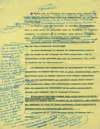 1972] ; 11 pages in-4°. Ce tapuscrit a été considérablement corrigé et remanié par François Mitterrand après qu’il lui ait été