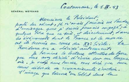 Je pense comme vous que le texte de la lettre que le Gal Catroux m’a adressée à Alger doit être intégrale-