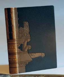 maroquin bleu nuit, dos sans nerf orné d’une composition de style architectural représentant une gargouille en chagrin gris, doublures
