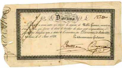 pour 1000 francs pour une action du Diorama à dater du 11 juillet 1822. Le Diorama de Louis Daguerre est conçu par son inventeur