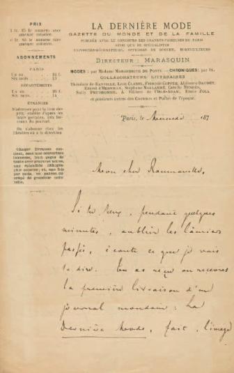 de cette publication (le seul des journaux de Mode rédigé par des littérateurs) fais-le ». Il ajoute que Mme Roumanille recevra