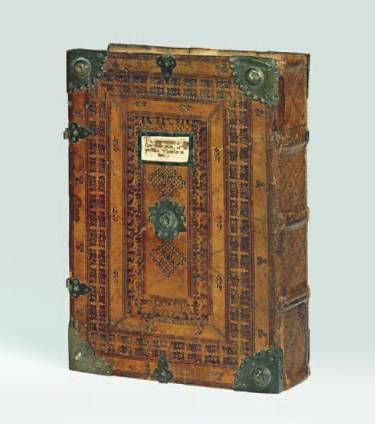 TRÈS BELLE RELIURE ENVEAU ESTAMPÉÀ FROID SURAIS DE BOIS RENFORCÉE D'ÉCOINÇONSMÉTALLIQUES.