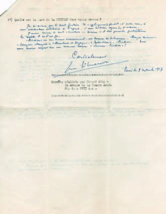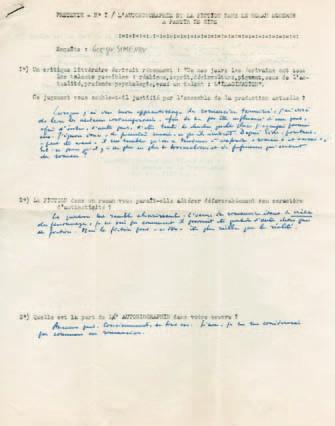 Réponses à une enquête sur l’autobiographie et la fiction dans le roman moderne, réalisée par Edmond Alvy pour la revue Prétexte , où une partie des réponses fut publiée dans le n° (joint) de janvier-février 1958 ; nous signalons par un P les textes publiés. La plupart des réponses sont faites sur le questionnaire dactylographié, qui comporte quatre questions : sur l’imagination dans la littérature moderne, la fction et l’authenticité, la part d’autobiographie et celle de la fction dans l’œuvre de la personnalité interrogée.