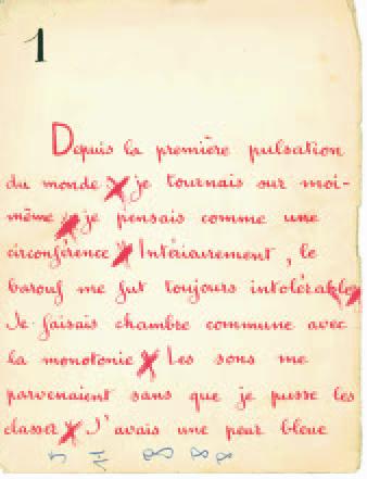 Le manuscrit est calligraphié de la belle écriture de Pichette au verso de feuillets de papier vergé, principalement à l’encre rouge avec certains passages à l’encre noire. Il ne porte pas de titre mais seulement un gros numéro 1 à l’encre noire (cette première Épiphanie sera intitulée « La Genèse »). Il présente des variantes de texte avec le texte publié (notamment trois phrases biffées page 22), des corrections et des additions, mais surtout il est le témoin du passage du poème au texte théâtral. Si Pichette avait prévu des interventions extérieures dans le monologue, notées en noir, il revoit ici son texte en vue d’un découpage à plusieurs voix, insérant des coupures fortement marquées à gros traits, avec parfois des initiales (A, Mr, W) ; il supprime également la ponctuation au début du monologue.