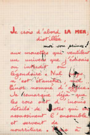 Cargèse 28 juillet 1948 : « La Corse déçoit aussi fortement qu’elle séduit. Mais, peu à peu, on sent la beauté future de la colère ; et l’on se met à aimer sans réserves. Bientôt, nous remonterons sur le ring. ––– Tant de feurs courroucées, tant de clowns graces exigent la mise à mort »… Belle évocation poétique du soleil et des nuages ; il orne sa lettre de dessins du soleil, d’étoiles et d’une langouste… 21 août : « Fou travail, fou soleil, folle pleine lune, fol ouragan, plus on est de fous plus on danse »… Croquis du soleil et d’une feur… Combloux 7 juin 1949 . Il se trouve à Combloux, en Haute-Savoie, « travaillant re et re au Point [ Le Point vélique ]. Puis m’y assoupissant, le général et le particulier »… [Paris] 6 juillet , amitié à l’occasion d’une opération… [17 août] , longue lettre angoissée : leur amitié généreuse lui est précieuse en un moment d’affaire de famille pénible : « Que voulez-vous que je contrôle ? Ai-je affaire à une sainte – qu’il faut détruire ? Ou à une petite menteuse – qu’il faut épargner biologiquement ? – Et suis-je un poète, un rien du tout ou encore quelque chose d’autre ? »… [1949 ?] . « Le “point” [ Le Point vélique ] est sur le point. Ces jours-ci c’est la “jeunesse” qui m’occupe. C’est, par exemple, l’avenir de Lise et de Marc »…