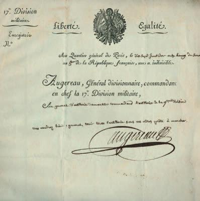 aussi par Daunou, secrétaire, 24 fructidor (10 septembre 1795) ; 1 page in-fol., en-tête Extrait du registre des arrêtés du Comité de Salut public de la Convention nationale , belle vignette gravée par Quéverdo pour le Comité de Salut Public, Section de la Guerre [BB n° 46]. 300/400