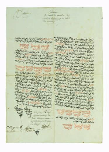 Administrateurs du droit d’enregistrement et des domaines nationaux de l’Égypte, [16 septembre 1798] ; 1 page grand in-fol. (36,5 x 51,5 cm) à l’encre noire et rouge ; en arabe. 2.500/3.000