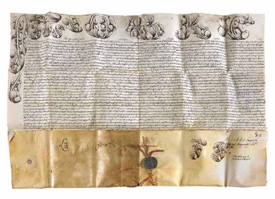 Grande feuille de parchemin (81 x 73 cm), écrite en latin, à l’encre brune, munie de la bulle de plomb sur cordelette de soie rouge & jaune ; lettrines & signatures.