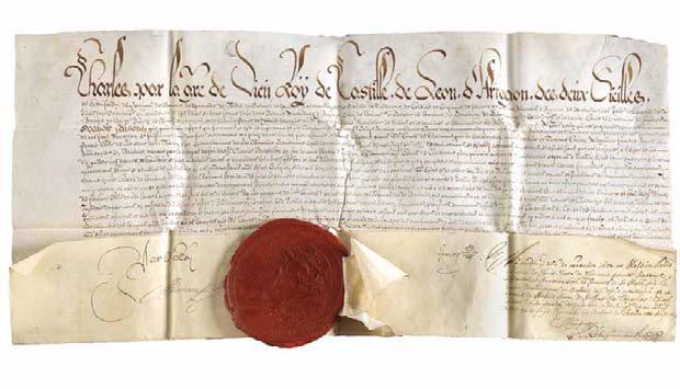 Feuille de parchemin (62 x 38 cm), écrite en français à l’encre brune, munie du sceau royal (cire rouge) appendu sur double queue de parchemin; contreseings.