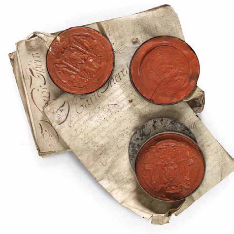 Cahier de trois bifeuillets de parchemin, (2 écrit en français, à l’encre brune, paraphé, muni (& aujourd’hui séparé) du sceau de Marie-Thérèse, en cire rouge-brique, dans blanc.