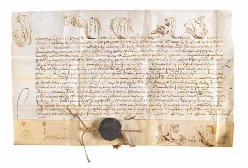 Une feuille de parchemin (32 x 23 cm) écrite en latin, à l’encre brune, sur 15 lignes, munie de sa bulle de plomb sur cordelettes de chanvre; nombreuses signatures, lettrines.