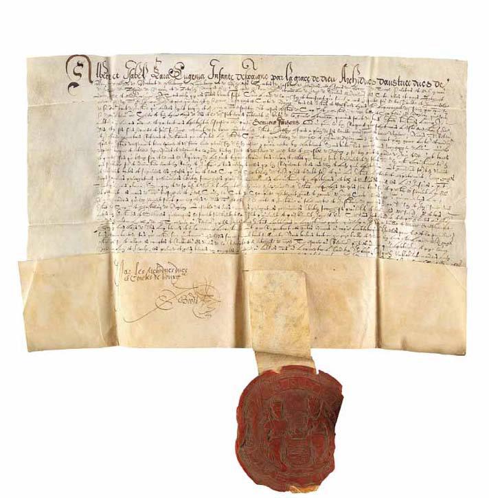 Lettres patentes données par Albert & Isabel Clara Eugénia, Infante d’Espagn par la Grace de Dieu, Archiduc d’Autriche, ducs de Bourgogne, de Lothier, de Braban de Limbourg, de Luxembourg et de Gueldre, Comtes de Habsbourg, de Flandres, d’Artois de Bourgogne & de Tyrol palatin, et de Hainaut, de Hollande, de Zélande, de Namur,et Zutpfen, marquis du Saint Empire de Rome, seigneur et dame de Frise, de Salins, de Malines, des cités, ville et pays d’Utrecht, à qui tous ceux qui ces présentes verront, Salut . Ils nomment Loys de Vers, capitaine et chatelain de leur ville et chateau de Nozeroy. Bruxelles, 10 mars 1600.