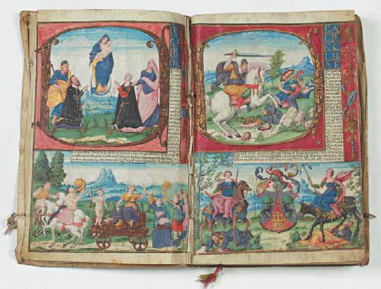 • au début : deux pages en vis-à-vis entièrement enluminées : en haut d’une lettrine historiée (Vierge à l’Enfant priée par le couple anobli présentés chacun de son saint patron; & Saint Jacques Matamore); & en bas, d’une scène allégorique (cortège; armoiries entourées de la Vérité Révélée sur un chameau foulant la fausse Science, et de la Foi sur un taureau foulant l’Incrédulité).