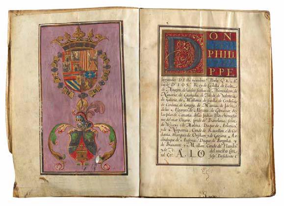 • ƒ 1 verso : large peinture héraldique, pleine page, illustrant les grandes armes d’Espagne, entourées du collier de l’Ordre de la Toison d’Or, ainsi que les armes de (Diego de Valladolid) sommées d’un cimier, sur un fond de couleur lilas. • ƒ 2 : large lettrine décorée & peinte.