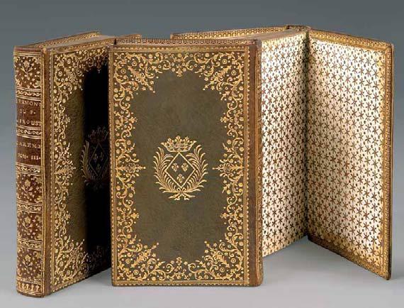 Trois volumes in-8°, plein maroquin vert olive, large dentelle aux petits fers dorés, armoiries dorées au centre, flet doré courant sur les coupes, frise dorée sur les chasses, dos lisse orné, gardes de papier dominoté cuivré (rangées alternées d’étoiles & de points), toutes tranches dorées ( reliure de l’époque ).