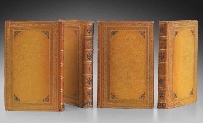 Quatre volumes in-8°, plein maroquin citron conft, multiples flets et frises dorés & à froid, quatre fers à froid aux angles de la réserve centrale, dos à nerfs ornés et fers romantiques à froid, roulette dorée courant sur les coupes, frise dorée sur les chasses, toutes tranches dorées, tranchefle verte et rose, gardes de papier ventre-de-chevreuil, signet de soie rose ( reliure de l’époque signée Thouvenin au pied du dos ).