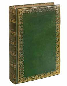 Un volume in-8°, plein maroquin à grain long vert Wimbledon, large frise romantique dorée encadrant les plats, dos lisse orné de fers romantiques, chainette dorée déroulée sur les coupes, coins guillochés, frise feurie dorée sur les chasses, toutes tranches dorées, tranchefle rose, blanche & prune, garde de papier kaki, signet de soie rose ( reliure de l’époque ).
