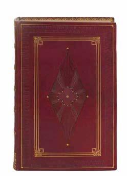 Un volume in-8°, plein maroquin amarante, flet doré encadrant les plats, frise « à l’égyptienne » à froid, triple flet doré avec feurs de lys stylisées dorées, large fer losangé à froid au centre des plats, dos à nerfs orné de fers romantiques dorés, roulette dorée courant sur les coupes, frise dorée sur les chasses, toutes tranches dorées, tranchefle argent et azur, signet de soie verte ( reliure de l’ époque signée de Thouvenin ).