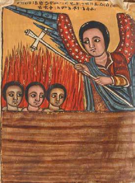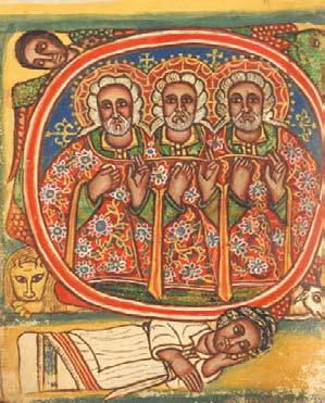 • ƒ 1 recto : Crucifxion avec, au-dessus du Christ, les anges Michel & Gabriel ; à ses côtés, le bon & le mauvais larron ; en bas à sa gauche, Marie & Jean ; en bas à sa droite, deux soldats dont Longin avec sa lance (cette illustration, comme toutes celles du manuscrit, est légendée en guèze). • ƒ 3 verso : Couronnement d’épines avec, à droite de Jésus, Anne et, à gauche, Caïphe. • ƒ 4 verso : Gabra Manfas Qeddous, un des saints les plus populaires d’Éthiopie. • ƒ 5 verso : la sainte Trinité « maîtresse du ciel ». • ƒ 6 verso : l’archange Michel.
