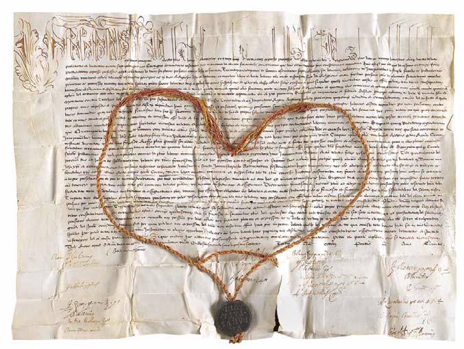Feuille de parchemin (49 x 36 cm), écrite en langue latine sur 32 lignes; munie de la bulle de plomb du pape, sur cordelette de soie rouge et jaune; grandes lettrines; nombreuses signatures et contreseings.