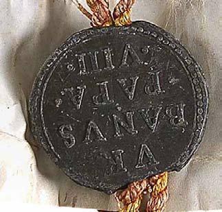Urbain, évêque, serf des serfs de Dieu, à son dilecte fls Thomas Pallavicino, profès de l’Ordre des frères Prêcheurs, salut et bénédiction apostolique . Le pape règle la répartition d’une somme de trente ducats d’or à affecter à la réparation de la basilique du Prince des Apôtres de la Ville, pour la croisade sainte et l’expédition contre les Turcs & autres Infdèles. Donnée à Rome, près Sainte Marie Majeure, l’an de l’Incarnation dominicale 1627, le 3 des nones d’octobre.