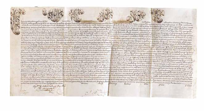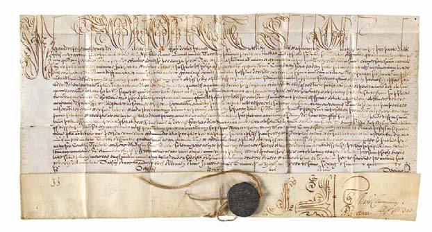 Feuille de parchemin (42 x 27 cm), écrite en latin, à l’encre brune, munie de la bulle de plomb sur cordelette de chanvre ; lettrines & signatures.