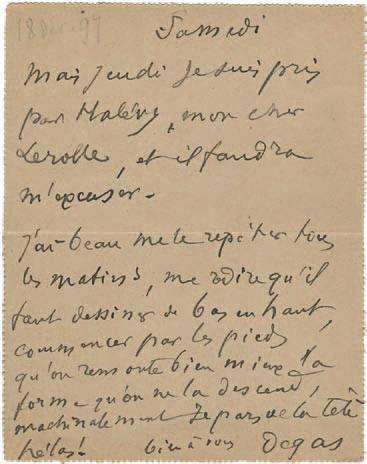 148. Edgar DEGAS . L.A.S., Samedi [18 décembre 1897], à Henry L erolle ; 1 page in-12, adresse (carte-lettre). 2.000/2.500