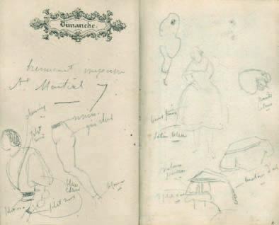 17 pages au crayon d’un carnet in-16 Souvenir de la semaine , avec calendrier dépliant, plats de laque noire incrustée d’ornements de métal doré et titre Souvenir, gardes de moire rouge. 500/700 Dans un semainier, Gavarni a noté des rendez-vous (« M r de Lavergne », « M r de Villain », « M me Desauges », etc.), des types de pollens et de larves, des bribes de conversation ou citations (« Des voyous. Viens-tu à l’opéra ? Non je vais au Café anglais », etc.). Il a aussi dessiné des vêtements ou costumes (avec indications de couleurs), une tête d’homme (avec la légende : « Le mariage ancien sans sel »), des femmes agenouillées, ou pleurant, etc.