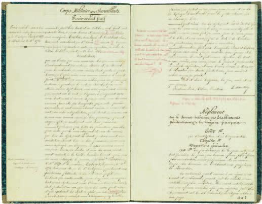 « Tous les surveillants détachés sur les établissements pénitentiaires seront pourvus d’un cahier d’écriture, sur lequel ils transcriront des articles des divers règlements sur la transportation, ainsi que des procès-verbaux fctifs concernant les crimes et délits que peuvent commettre les transportés, et dont le sujet sera indiqué à l’avance » (1 er cahier, f. 2). Sont ainsi consignés différents ordres, décrets, articles et extraits du code de justice militaire concernant le corps des surveillants, ainsi que des exercices de dictée et de rédaction de procès-verbaux.
