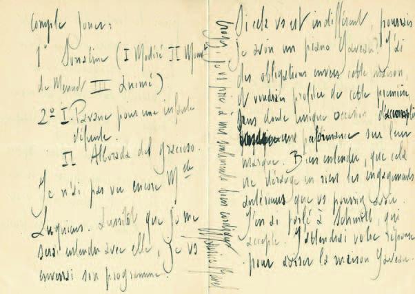 P rojet de concert au H avre . Il prie d’excuser son silence. « Voici près d’un mois que je travaille comme une brute : l’acte avec Franc-Nohain [ L’Heure espagnole ]. C’est presque à moitié établi. Mais j’y passe mes journées entières, prenant à peine le temps des repas, et sortant humer un peu d’air le soir. Tranquillisez-vous : je travaille aussi un peu mon piano. Je n’y fais pas beaucoup de progrès, mais, sans espérer éblouir vos compatriotes par ma virtuosité, je pense m’en tirer le 8 juin sans trop de fausses notes ». Il donne le détail de son programme : « 1° Sonatine (I Modéré, II Mouv t de Menuet III Animé) 2° I Pavane pour une infante défunte II Alborada del gracioso . […] Si cela vous est indifférent, pourrais-je avoir un piano Gaveau ? J’ai des obligations envers cette maison et voudrais profter de cette première, sans doute unique occasion d’accomplir une performance sur leur marque »…