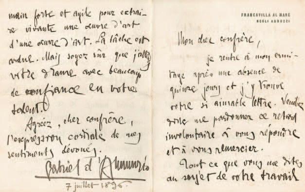 324. Gabriele d’ANNUNZIO (1863-1938). 2 L.A.S., Francavilla al Mare negli Abruzzi juin-juillet 1896, à son traducteur Georges H érelle et à