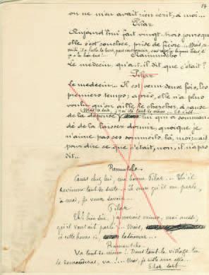 des feuillets de papier vergé, 2 cachets encre de l’ Agence générale de copies dramatiques et littéraires H. Compère . 1.000/1.200 F ragments de l ’ adaptation scénique du roman R amuntcho . La pièce en 5 actes et 11 tableaux fut créée le 29 février 1908 à l’Odéon sous la direction d’A ntoine , avec une musique de scène de Gabriel Pierné, dans des décors de Jusseaume. Le présent manuscrit comprend, outre le titre, des feuillets ou fragments (paginés 14-19, [21]-22, 28-29, 31, 36, 39). Loti a porté sur cette copie établie pour le souffeur des corrections, et a inséré d’ importantes additions autographes , soit une dizaine de pages. Dans ces pages, l’action se situe d’abord à la veille du départ de Ramuntcho pour son service militaire : Gracieuse vient à la cidrerie faire ses adieux à Ramuntcho sous l’œil vigilant de son frère Arrochkoa ; il y a un épisode de dépit entre Dolorès et Franchita, leurs mères… On voit aussi les villageois venir complimenter leur fameux joueur de pelote avant son départ. Un échange agressif entre Franchita et Dolorès, interrompu par le curé, est entièrement autographe.