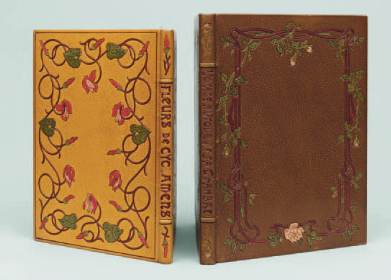 et fleurs de rosier, dos à 2 nerfs avec titre et roses mosaïquées, encadrement intérieur du
