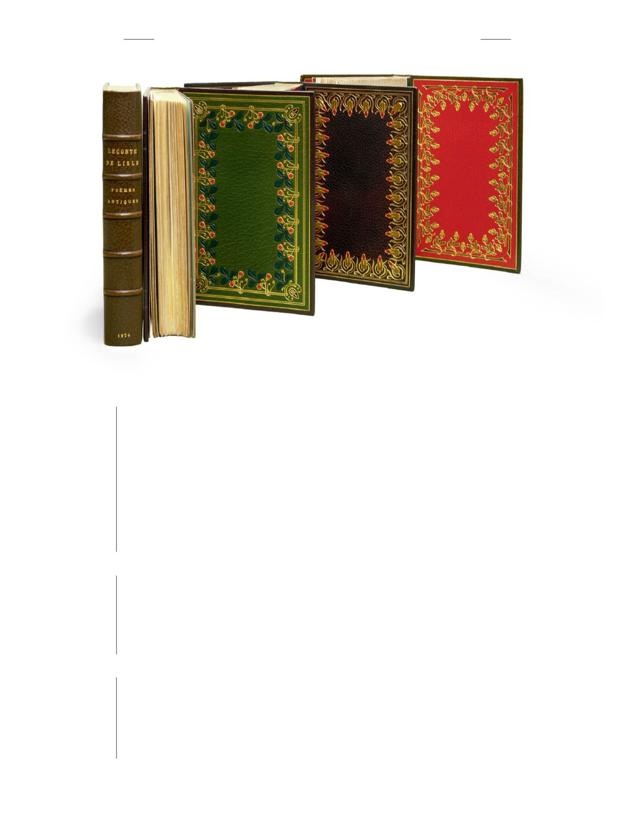 maroquin rouge, vert olive, vert lierre et lie de vin avec riches encadrements floraux aux filets et fers spéciaux dorés et fleurs