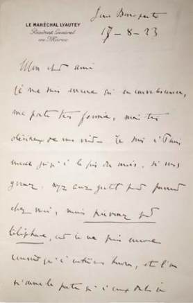 46 LYAUTEY. Lettre autographe de 2 pages in-8 datée 17/8/1923 adressée à un ami