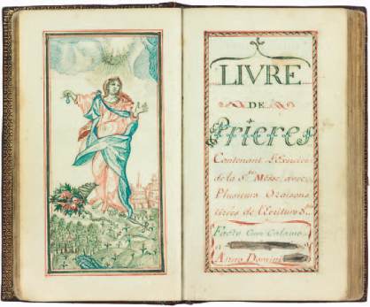 Charmant manuscrit de dévotion du milieu du dix-huitième siècle, calligraphié à l’encre noir, rose et vert, orné d’une figure