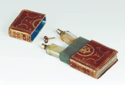 340 RELIURE. — Boite-étui à parfum en forme d’almanach, en maroquin rouge décoré, contenant deux petits flacons.