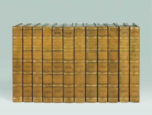 12 volumes in-8, demi-cuir de Russie fauve avec coins, dos lisse orné de motifs dorés et à froid, tranches mouchetées