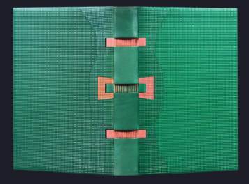 et pièces de box rose bonbon, décor géométrique sur les 2 plats, composé de pièces d’anilou en vert canard et rose