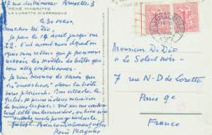 La carte postale est également relative au projet du livre ainsi qu’une lettre tapuscrite en anglais de Magritte adressée à