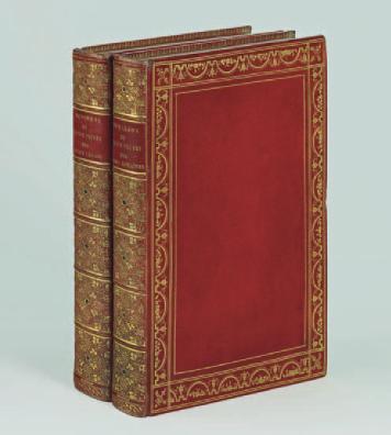 Ensemble 2 ouvrages en 2 volumes in-4, maroquin rouge à long grain, filets hachurés encadrant une large bordure