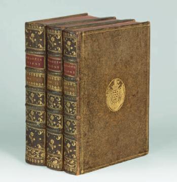 autres pièces y mentionnées. S.l.n.d. 3 volumes in-4, veau marbré, triple filet, armoiries au centre, dos orné, tranches