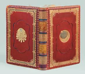 encadrement à froid, armoiries au centre du premier plat, dos orné, tranches dorées (