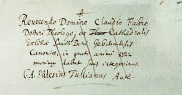 ENVOI DE L’AUTEUR, en latin, adressé à Dom Claude Fabre, ou Lefèvre.