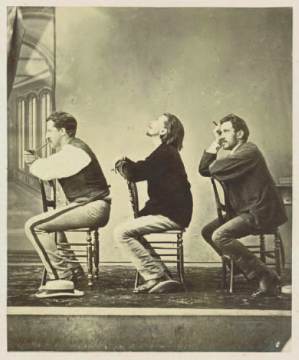 chapeaux à terre. Il est entouré de ses deux amis, Aimé Vacher et Ludovic Alexandre, chacun fumant, assis sur une chaise