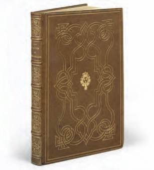 chagrin havane, autour des plats, jeu de filets enserrant un décor d’entrelacs, l’ensemble doré, armes au centre, dos à