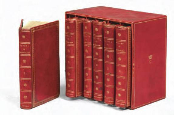 ], 6 vol. in-12, maroquin rouge cerise à grains longs, filets azurés droits et roulette torsadée autour des plats, dos