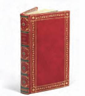 rouge à grains longs, autour des plats, roulette florale sertie de doubles filets dorés, dos lisse orné d’un décor mosaïqué