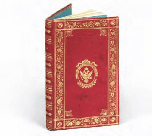 florale sertie de doubles filets, armes au centre, l’ensemble doré, dos lisse orné, doublure et gardes de tabis bleu céleste,