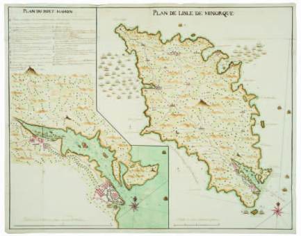 sur sa partie gauche, le détail de la rade de Port Mahon avec le fort Saint-Philippe. Y sont figurés les chemins, les villages